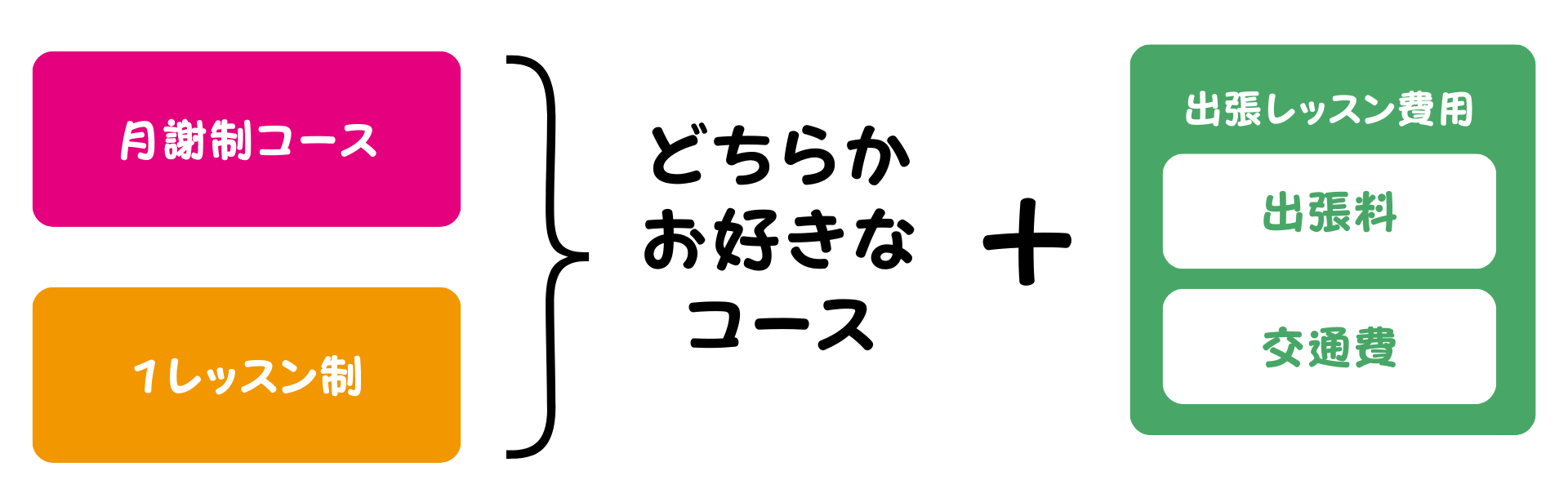 | 交通費 | レッスン回数×交通費実費。 公共交通機関の運賃、もしくはガソリン代で算出します。 例)交通費500円の場合 3回レッスンの月…1500円 4回レッスンの月…2000円 |